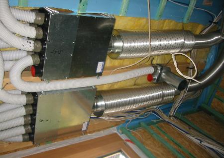 Menden: 40 KW Luftheizung für die Schützenhalle Platte - Heide Iserlohn: Kontrollierte Wohnraumlüftung für ein 1-Fam. Holzhaus mit Passivhausstandart. Absug- und Einblassammler unter der Decke montiert. |